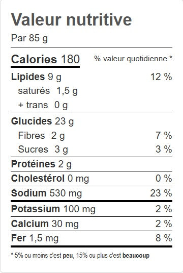 Ingrédients : Oignons rouge • Eau • Huile végétale (huile de soya et/ou huile de canola) • Farine de blé • Farine de maïs jaune • Sel • Sucres (sucre, dextrose) • Épices • Farine de soya dégraissée • Poudre à pâte • Poudre d’oignon • Sel de mer • Amidon de maïs • Lecithine de soya • Poudre d’ail