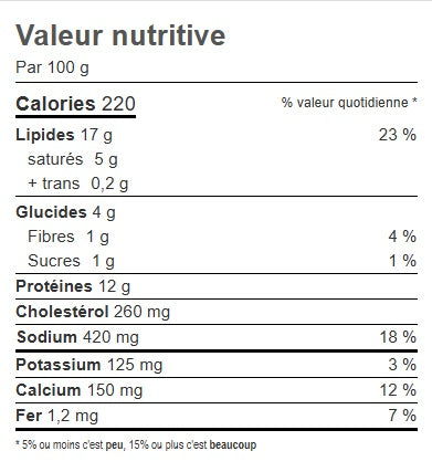 Oeuf entier liquide, Eau, Fromage cheddar (lait pasteurisé, culture bactérienne, sel, enzyme microbien, rocou, cellulose, natamycine), Huile de canola, Poudre de lait écrémé, Fibre de cosses de pois, Sel, Sucres (maltodextrine de maïs, dextrose), Acide citrique, Gomme de guar, Gomme xanthane, Silicate de calcium, Arôme naturel, Bêta-carotène.
