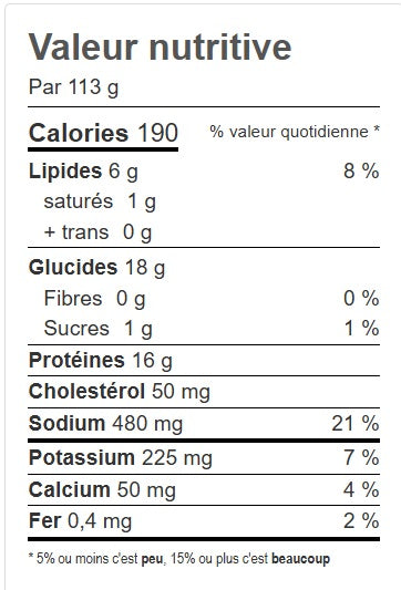 Merlu du Cap, Farine (riz, maïs), Eau, Amidon de maïs modifié, Huile de canola, Fromage (cheddar, parmesan), Amidon (maïs, riz), Sel, Assaisonnements (ail, oignon, fines herbes, extrait de levure, épices, phosphate disodique), Substances laitières modifiées, Sucres (sucre, dextrose), Protéines de pois, Essence, Farine de guar, Bicarbonate de soude, Levure.
