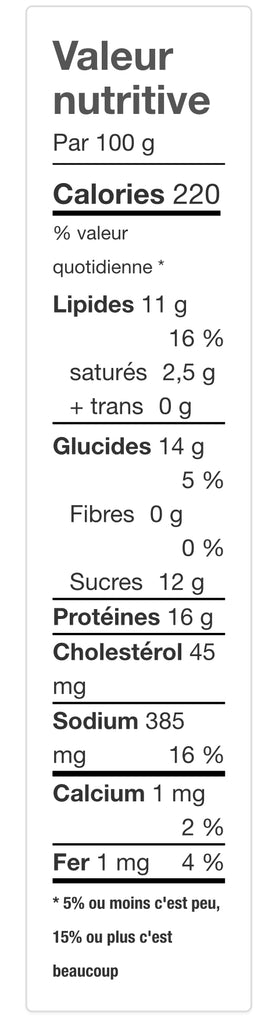 Saumon , Cassonade, Erable BBQ Sauce (legumes deshydrates [la tomate, l'oignon, l'ail]), Sucre, Eau, Sucre d'erable, Dextrose, Sel, Epices, Acide acetique, Worcestershire Sauce poudre (le vinaigre, melasse, sirop de mais, sel, ail, sucre, epices, tamarin, arome, maltodextrine), Legume (huile de canola,Régulateur d'acidité: l'acétate de sodium).
