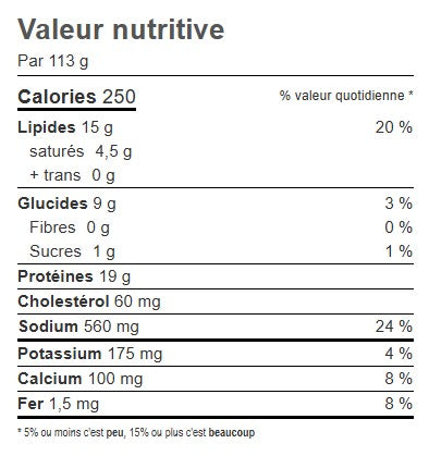 Poitrine de poulet assaisonnée (poulet, eau, amidon de riz, concentré de jusde citron, sel, vinaigre, sucre, essence), Produit de fromage fondu (fromage suisse et fromage cheddar [substances laitières, culture bactérienne, sel, enzyme microbien],crème, phosphate de sodium, sel), Jambon cuit (porc, eau, sel, Sucres [dextrose],phosphate de sodium, ascorbate de sodium, nitrite de sodium), Huile végétale (canolaet/ou soja), Farine enrichie, Eau, Farine de maïs, Substances laitières modifiées, Sel, Sucres (dextrose), Mélange de fromages romano et parmesan (lait, culture bactérienne, sel, acide sorbique, enzyme microbien), Poudre à pâte, Levure, Épices, Essence, Oléorésine paprika, Extraits de curcuma, de paprika et de rocou.