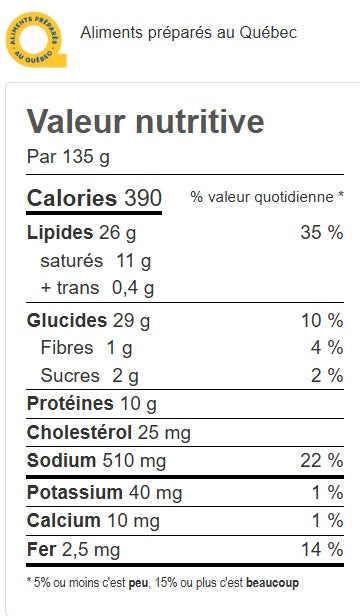 FARCE: Boeuf cuit (boeuf, sel, épices, fines herbes), eau, champignon, vin rouge (sel, sulfites), base (protéines hydrolysées de maïs et de soya, fécule de pomme de terre modifiée, extraits secs de glucose, sucre, fécule de pomme de terre, vin rouge déshydraté, lait écrémé en poudre, légumes déshydratés (oignon, tomate, betterave), huile de canola, caramel en poudre (sulfites), extrait de levure, levure torula, gomme xanthane, saveurs naturelle et artificielle, acide malique, colorants), amidon de maïs modifié, oignon déshydraté, épices, fines herbes. PÂTE: Farine de blé enrichie, margarine d'huile de palme modifiée, eau, sel.