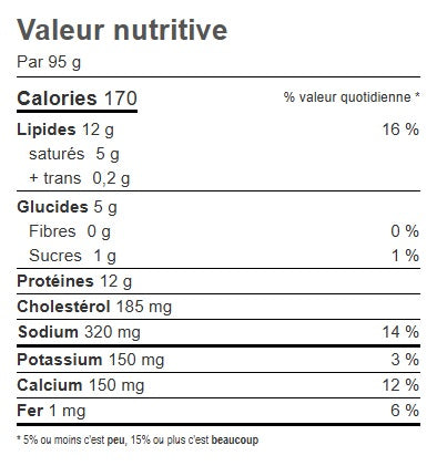 OEUF ENTIER LIQUIDE, FROMAGE MOZZARELLA (LAIT PASTEURISÉ, SUBSTANCES LAITIÈRES MODIFIÉES, SEL, CULTURE BACTÉRIENNE, ENZYME MICROBIEN), FROMAGE CHEDDAR (LAIT PASTEURISÉ, CULTURE BACTÉRIENNE, SEL, ENZYME MICROBIEN, ROCOU), POMMES DE TERRE (POMMES DE TERRE, SEL DE MER, DEXTROSE, PHOSPHATE DE SODIUM), CHAMPIGNONS, BACON (PORC, EAU, SEL, PHOSPHATE DE SODIUM, ÉRYTHORBATE DE SODIUM, NITRITE DE SODIUM, FUMÉE. PEUT CONTENIR SUCRE, CASSONADE, CHLORURE DE POTASSIUM, ÉPICES, SAVEUR), POIVRONS ROUGES, CRÈME (LAIT, CRÈME, MONO ET DIGLYCÉRIDES, PHOSPHATE DISODIQUE, CITRATE DE SODIUM, CARRAGHÉNANE), OIGNONS SAUTÉS (OIGNONS, HUILE DE COLZA), AMIDON DE MAÏS MODIFIÉ, ASSAISONNEMENTS.
